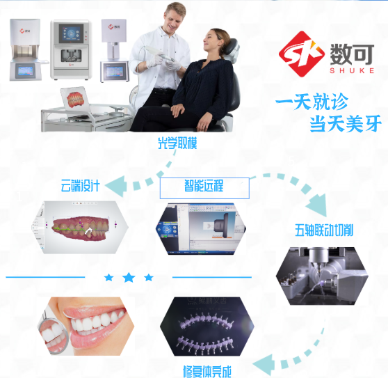 鯤鵬椅旁一站式解決方案,代替傳統義齒加工流程,讓修復更方便更快捷。通過數字化取像(口掃)→CAD/CAM 設計→五軸聯動多功能切削機→結晶/上釉→修復體完成。實現 “一次就診,當天美牙” 的超高效率!大大節約了患者的就診時間,為臨床服務提供了更元化的選擇。
